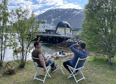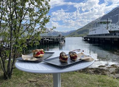 Kaféen ligger rett ved kaikanten for de som kommer med ferja, eller så er det en perfekt mulighet å leie noen el-sykler hos ArctiConcepts og gjøre det om til en liten formiddagstur.